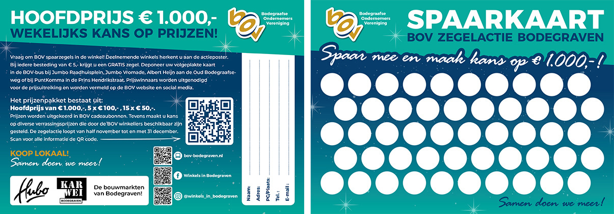 Vraag om een spaarkaart en BOV spaarzegels bij de deelnemende winkels herkenbaar aan de actieposter. Bij iedere besteding van € 5,- krijgt u een GRATIS zegel. Vermeld uw naam en adresgegevens op de kaart en deponeer deze in de BOV-bus in Jumbo Vromade, Jumbo Raadhuisplein, Albert Heijn aan de Oud Bodegraafseweg of bij PuntKomma in de Prins Hendrikstraat. Er zijn trekkingen op maandag 8, 15, 22 en 29 december 2025 en op vrijdag 2 januari 2026. Prijswinnaars krijgen persoonlijk bericht en worden vermeld op de BOV website en op de BOV facebook en BOV insta. De prijsuitreiking zal plaatsvinden op zaterdag 10 januari 2025 om 15.30 uur bij PuntKomma in de Prins Hendrikstraat.
